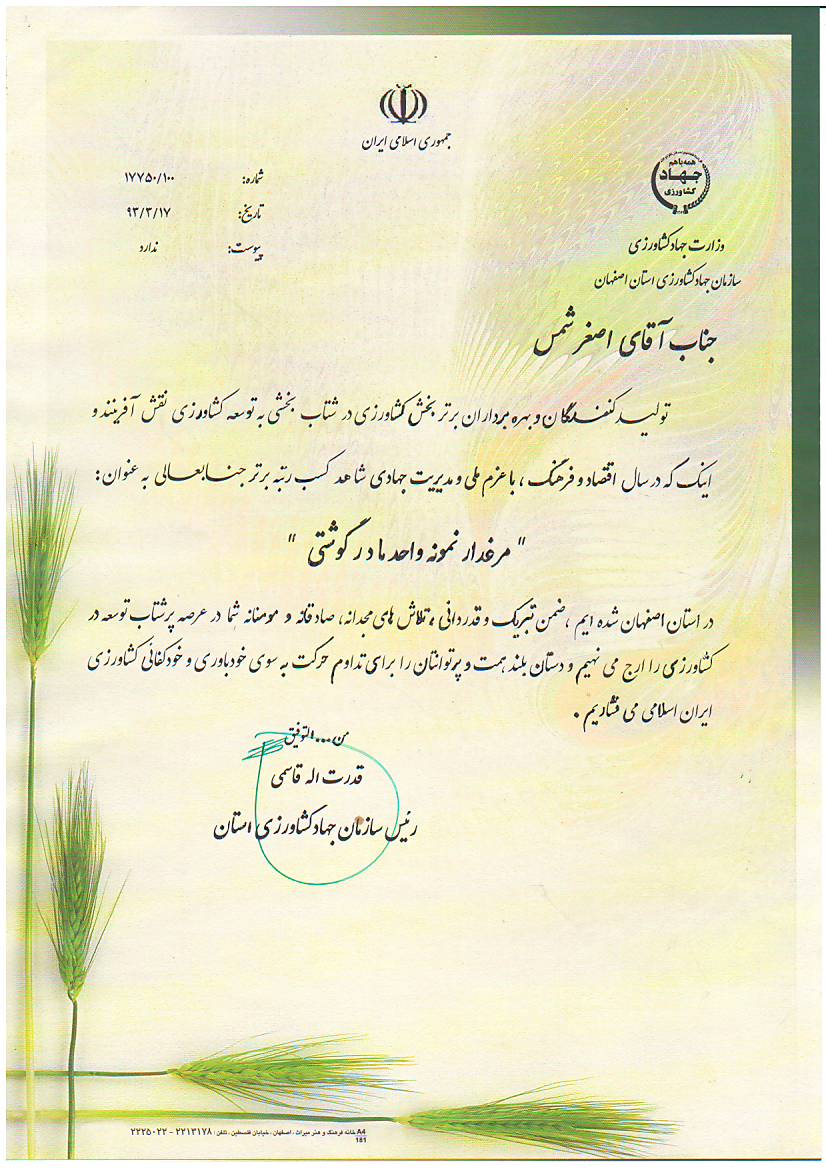 A sample poultry farmer of the broiler mother unit from the head of the Agricultural Jihad Organization